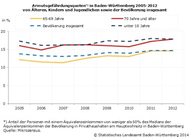 Die Familien-Forschung Baden-Württemberg im Statistischen Landesamt hat im Auftrag des Sozialministeriums einen ersten Kurzreport zur Einkommenslage und Armutsgefährdung älterer Menschen in Baden-Württemberg erstellt. Dieser ist ein Baustein der neu eingeführten Armuts- und Reichtumsberichterstattung des Landes. Der erste umfassende Armuts- und Reichtumsbericht für Baden-Württemberg, dessen Erstellung vom Landesbeirat für Armutsbekämpfung und Prävention begleitet wird, wird im Jahr 2015 vorgelegt. Sein Schwerpunkt wird das Thema Kinderarmut sein. Das Konzept der Landesregierung sieht vor, diesen Bericht durch aktuelle Kurzreports und Kongresse zu ergänzen.